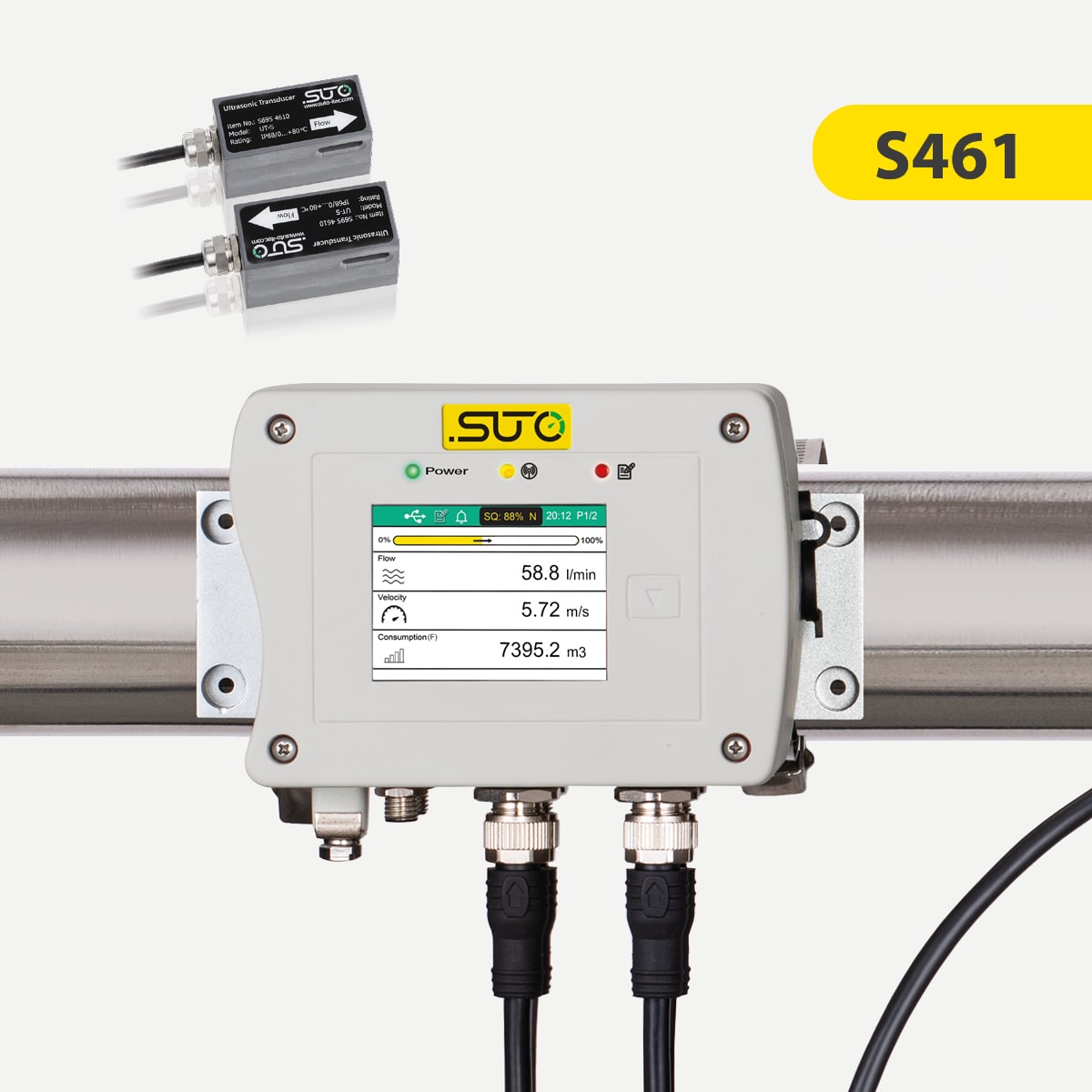 The SUTO S461 ultrasonic flow meter allows accurate, fast, and non-contact measurement of liquid flow and consumption. Using transit-time technology, the sensors are mounted externally on the pipe, avoiding any interference with the liquid.